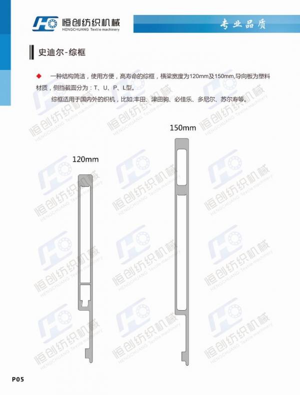 一种结构简洁,使用方便,高寿命的综框,横梁宽度为120mm及150mm,导向板为塑料材质,侧挡截面分为:T、U、P、L型。